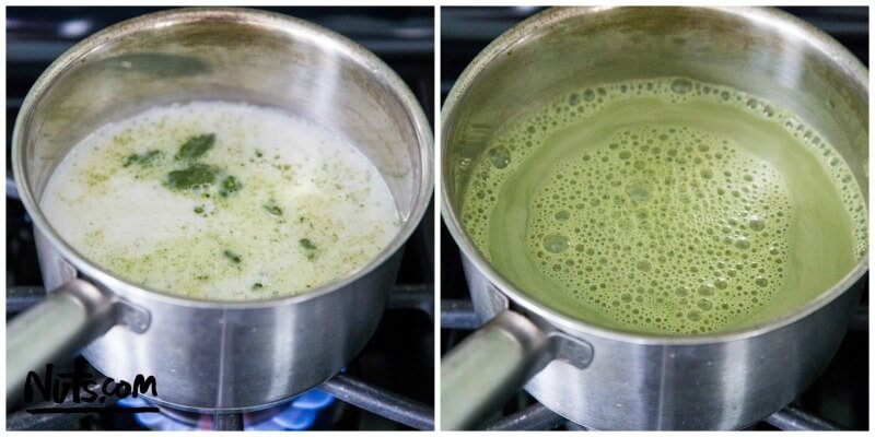 - Over medium-low heat, warm the almond milk in a saucepan. Bring to a boil. Turn the heat off and add the sugar, vanilla and matcha green tea powder. Whisk until the matcha powder dissolves completely.